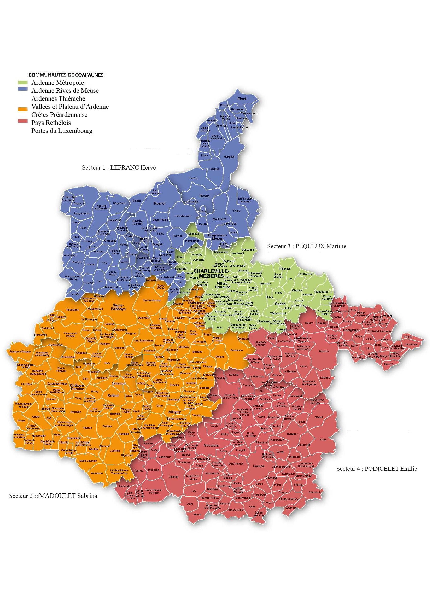 Sabrina MADOULET : Communauté de Communes des Crêtes Pré-ardennaises, Communauté de Communes du Pays Rethelois et les collectivités incluses dans ces périmètres.
